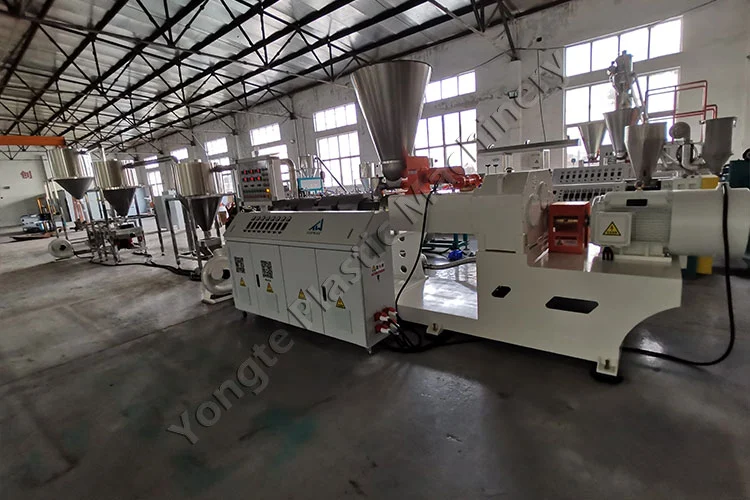 Ing taun 2024, kita ngrancang mesin pelletizing senyawa PVC khusus kanggo klien Polandia, sing dirancang khusus kanggo ngasilake granul masterbatch PVC saka pengisi PVC lan CaCO₃ daur ulang. Isi pangisi CaCO₃ bisa diatur kanthi fleksibel antarane 40% lan 80% kanggo selaras karo spesifikasi produksi pelanggan. Komponen utama kalebu feeder otomatis, SJSZ80 / 156 conical twin-screw extruder (motor 75kW kanthi inverter frekuensi ABB, ngonsumsi ~ 50KW sajrone operasi stabil), die pelletizing panas kanggo nglereni granula seragam, lan 304 stainless steel telung tahap pendinginan hawa kanthi cepet lan sistem conveying. Mesin kasebut entuk kapasitas produksi 300-400 kg / jam lan dibangun kanggo operasi terus-terusan 24/7 kanthi nol downtime. Instalasi lancar, didhukung dening tim ahli Yongte, sing nyedhiyakake pitulungan pungkasan. Sawise instalasi, latihan ing situs menehi kekuwatan marang staf klien supaya bisa ngoperasikake peralatan kanthi cekap, dene dhukungan teknis remot liwat pandhuan video njamin resolusi cepet babagan masalah apa wae, njaga produksi tanpa gangguan lan kinerja puncak.