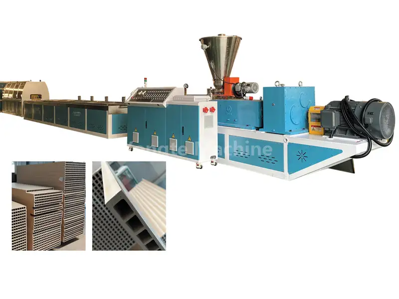 (1) Extruder sekrup kembar sing dirancang khusus kanthi efisien bisa ngeterake glepung kayu lan campuran resin PVC, kanthi cepet bahan plastik supaya ora karbonisasi glepung kayu utawa degradasi PVC, nambah efisiensi produksi lan nyuda konsumsi energi. (2) Iku nglengkapi motor servo kanggo ngurangi konsumsi daya 15-20%, gearbox vertikal drive langsung kanthi efisiensi transmisi dhuwur lan mlaku kanthi stabil, awet lan efisien energi lan sistem kontrol suhu otomatis.