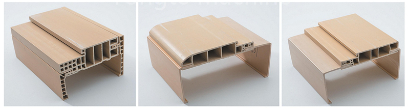 Plastik PE + 10% -15% serat kaca diperkuat + 50-60% bubuk kayu + lapisan co-extruded anti-penuaan + struktur sing diperkuat |
